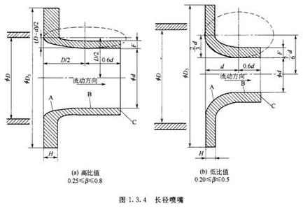 •標準噴嘴由垂直于軸線的入口平面部分A、圓弧形曲面B和C所構成的入口收縮部分、圓筒形喉部E和為防止邊緣損傷所需的保護槽F組成,其取壓方式上游取壓口采用角接取壓,下游取壓口可按角接取壓設置,也可設置于較遠下游處。噴嘴總長度