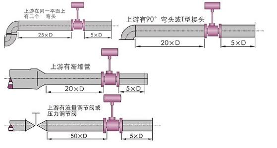 3、在儀表上下游提供足夠的直管段并確保非彎曲的對(duì)稱外形。盡可能在儀表下游安裝閥門。