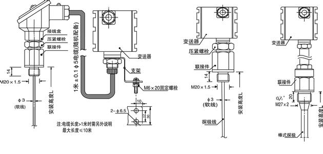 1、變送器采用電容測量原量,探極線的外絕緣層為耐高溫、耐腐蝕、抗老化且化學穩定性極高的聚四氟乙烯材料,正常工作中與被測液體之間處于絕緣狀態。安裝時一定注意保護好探極線的外絕緣層,一旦損傷,將導致使用壽命縮短或安裝失敗。