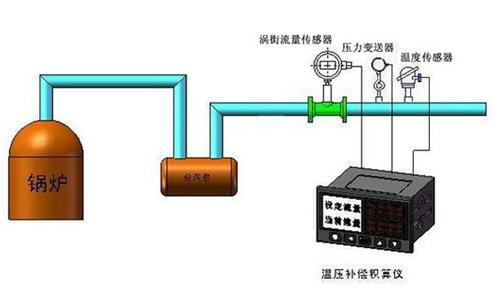 2.蒸汽流量計中的蒸汽密度補償 計量飽和蒸汽或過熱蒸汽常用質量流量,單位為kg/h。質量流量大小與蒸汽的密度有關,而蒸汽的密度又直接受蒸汽的壓力及溫度影響。在蒸汽流量計過程中,隨著蒸汽壓力及溫度不斷變化,密度也隨著變化,使質量流量也隨著變化。如果計量儀表不能跟蹤這種變化,勢必造成計量誤差。因此,在蒸汽流量計過程中一般都是通過壓力及溫度傳感器跟蹤蒸汽壓力及溫度變化來達到密度補償目的。飽和蒸汽的密度變化與其壓力或溫度成正比關系,因而單獨通過測壓力或測溫度都可以對飽和蒸汽進行密度補償。過熱蒸汽的密度與其壓力、溫度成函數關系,而不是正比關系。過熱蒸汽的密度補償必須同時測其壓力和溫度。現代蒸汽流量計都具有自動密度補償,例如孔板式差壓蒸汽流量計、渦街蒸汽流量計等。
