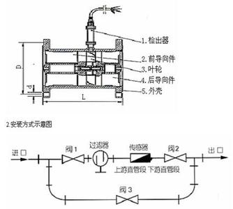 為了確保完整的功能,入口處的流型應不受干擾。上游直管段部分的長度應為渦輪流量計口徑(D)的大約15倍,下游直管段部分的長度應為流量計口徑(D)的大約5倍。在流體中設置非流線型漩渦發聲體,則從漩渦發生兩側交替地產生兩列有規則的漩渦,這種漩渦稱為卡曼渦輪。